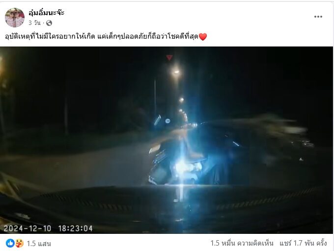 โดยเฉพาะคลิปนาทีเกิดเหตุ เสียงร้องลั่นทั้งตกใจและได้รับบาดเจ็บกันทั้งคัน พร้อมแคปชั่น “อุบัติเหตุที่ไม่มีใครอยากให้เกิด แค่เด็กๆปลอดภัยก็ถือว่าโชคดีที่สุด” ซึ่งทางเพจยังได้บอกด้วยว่า ขอบพระคุณทุกๆคนที่เป็นห่วงและอวยพรให้แม่หายไวๆ