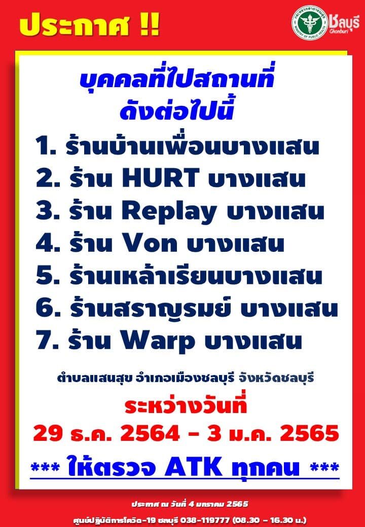 ล่าสุดเพจ สำนักงานสาธารณสุขจังหวัดชลบุรี สสจ.ชลบุรี โพสต์ถึงบุคคลที่ไปสถานที่ดังต่อไปนี้ในจ.ชลบุรี ให้ตรวจ ATK ทุกคน ประกอบด้วย 1.ร้านบ้านเพื่อนบางแสน 2.ร้าน HURT บางแสน 3.ร้าน Replay บางแสน 4.ร้าน Von บางแสน 5.ร้านเหล้าเรียนบางแสน 6.ร้านสราญรมย์ บางแสน 7.ร้าน Warp บางแสน ต.แสนสุข อ.เมืองชลบุรี จ.ชลบุรี ระหว่างวันที่ 29 ธ.ค. 2564 - 3 ม.ค.2565 ให้ตรวจ ATK ทุกคน
