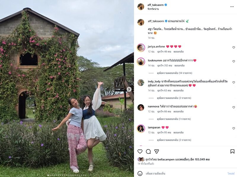 พร้อมแคปชั่นประทับใจด้วยว่า “ม่วนอกม่วนใจ๋ สฐา รีสอร์ต… โรงบ่มริมน้ำน่าน… บัวลอยป้านิ่ม… วัดภูมินทร์… ร้านเรือนเจ้านาง ” ด้าน ลูกน้ำ เพ็ญพิชชา พี่สาวของนนกุล ก็เข้ามาคอมเมนต์ด้วยว่า “อยากไปปปปปอีกกค่าาาา”