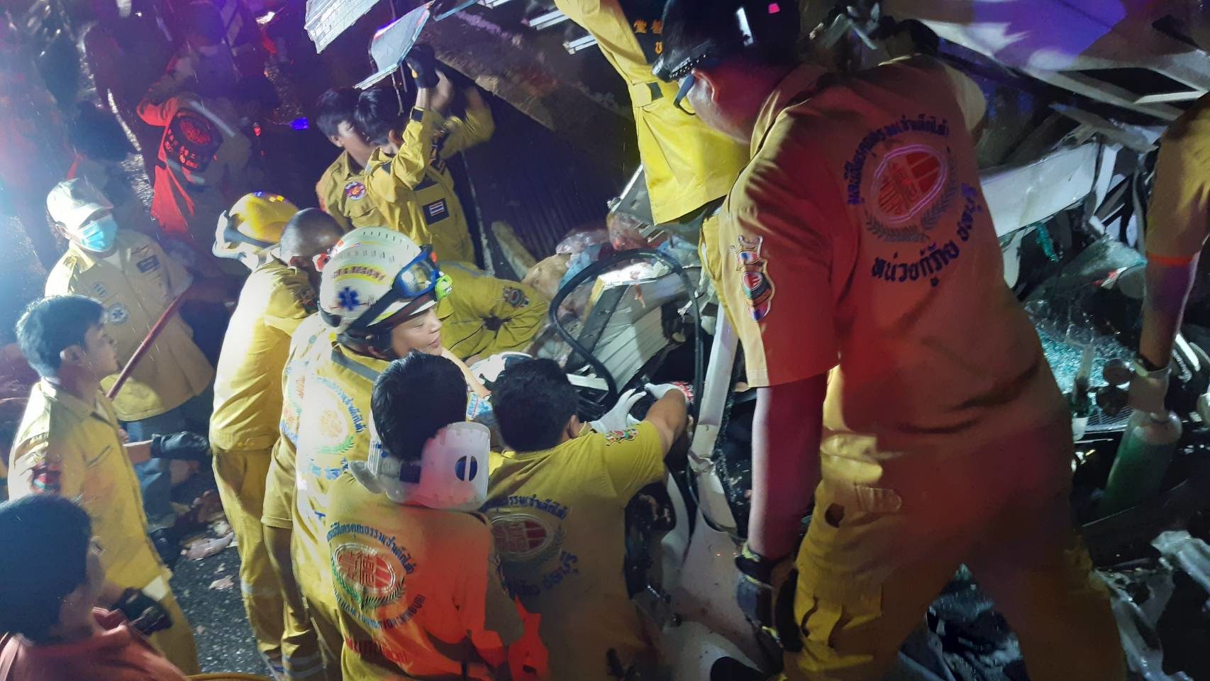 ที่เกิดเหตุพบรถกระบะยี่ห้อ โตโยต้า วีโก้ สีขาว ทะเบียน 2 ฒท 6391 กทม. บรรทุกเนื้อไก่สด สภาพพังยับเยินเป็นเศษเหล็ก ชนอัดติดกับหางพ่วงของรถบรรทุกหัวลากยี่ห้อ ฮีโน่ สีเหลือง ทะเบียนหัว 71-6582 นครปฐม ถนนเต็มไปด้วยไก่สดกระจัดกระจายเกลื่อนถนน ภายในรถพบคนขับคือ นายสิทธิชัย สารบรรณ อายุ 21 ปี ถูกแผงหน้าและโครงรถกดทับร่างอาการสาหัส กู้ภัยฯเร่งใช้อุปกรณ์ตัดถ่างงัดซากรถนำออกมาแล้วรีบปฐมพยาบาลพร้อมนำตัวส่งโรงพยาบาลชลบุรี