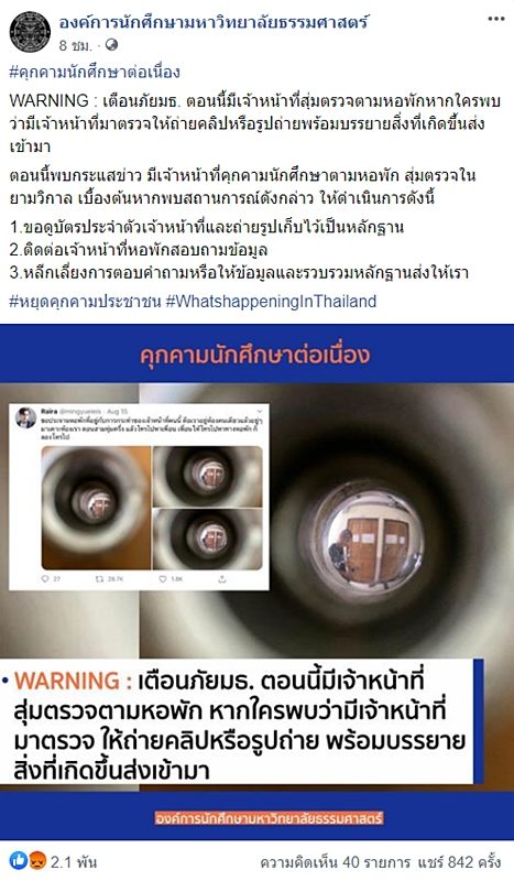 วันที่ 18 ส.ค. ผู้สื่อข่าวรายงานว่า แฟนเพจเฟซบุ๊ก องค์การนักศึกษามหาวิทยาลัยธรรมศาสตร์ ได้โพสต์ข้อความเตือนภัยหลังพบชายทรงผมเกรียนมาเดินตรวจหอพักนอก ภายในมหาวิทยาลัยธรรมศาสตร์ ศูนย์รังสิต โดยระบุว่า "#คุกคามนักศึกษาต่อเนื่อง WARNING : เตือนภัยมธ. ตอนนี้มีเจ้าหน้าที่สุ่มตรวจตามหอพักหากใครพบว่ามีเจ้าหน้าที่มาตรวจให้ถ่ายคลิปหรือรูปถ่ายพร้อมบรรยายสิ่งที่เกิดขึ้นส่งเข้ามา