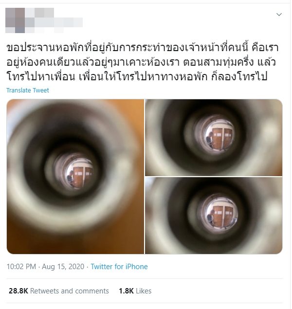 นอกจากนี้ ยังมีผู้ใช้ทวิตเตอร์รายหนึ่งได้ทวีตภาพพร้อมข้อความระบุว่า "ขอประจานหอพักที่อยู่กับการกระทำของเจ้าหน้าที่คนนี้ คือเราอยู่ห้องคนเดียวแล้วอยู่ๆมาเคาะห้องเรา ตอนสามทุ่มครึ่ง แล้วโทรไปหาเพื่อน เพื่อนให้โทรไปหาทางหอพัก ก็ลองโทรไป