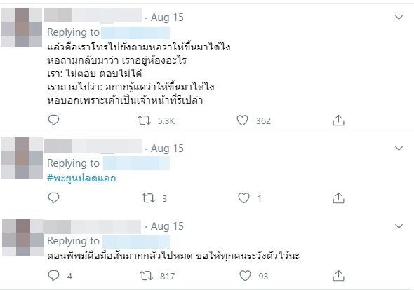 นอกจากนี้ ยังระบุต่อว่า "แล้วคือเราโทรไปยังถามหอว่าให้ขึ้นมาได้ไง หอถามกลับมาว่า เราอยู่ห้องอะไร เรา: ไม่ตอบ ตอบไม่ได้ เราถามไปว่า: อยากรู้แค่ว่าให้ขึ้นมาได้ไง หอบอกเพราะเค้าเป็นเจ้าหน้าที่รึเปล่า"