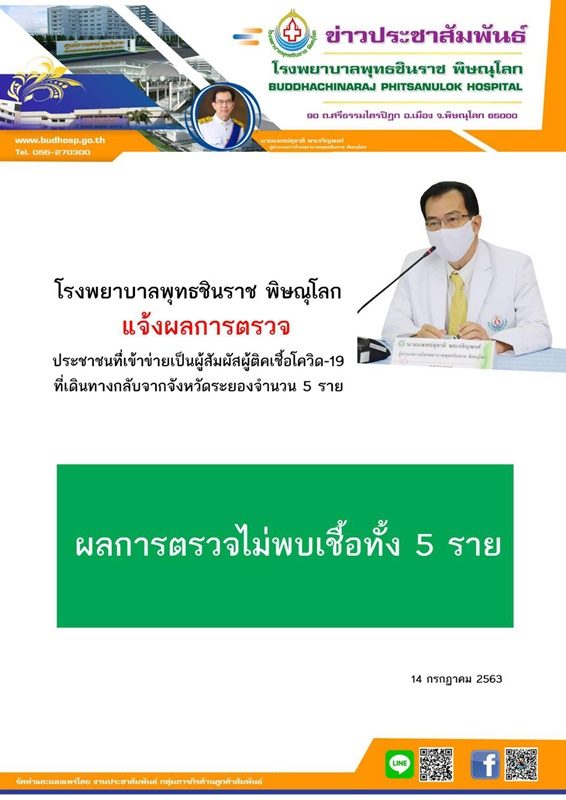 สำหรับประชาชนชาวพิษณุโลก 5 ราย ที่เดินทางกลับมาจาก จ.ระยอง และมีประวัติไปในสถานที่ที่พบผู้ป่วยยืนยัน (ทหารอียิปต์) ที่โรงแรม D Varee Diva Central Rayong ก่อนที่จะเดินทางกลับมา จ.พิษณุโลก ขณะนี้ทางโรงพยาบาลพุทธชินราช ได้ตรวจหาเชื้อให้ทั้ง 5 รายแล้ว ผลการตรวจปรากฏว่าไม่พบเชื้อไวรัส โควิด-19 ทั้ง 5 ราย ถึงแม้ว่าจะไม่พบเชื้อในการตรวจครั้งนี้ แต่ทั้ง 5 ราย ยังคงให้กักตัวเองที่บ้านพักส่วนตัว 14 วัน โดยกำหนดสิ้นสุดการกันกันตัววันที่ 25 ก.ค. พร้อมกับสังเกตอาการด้วยตนเอง