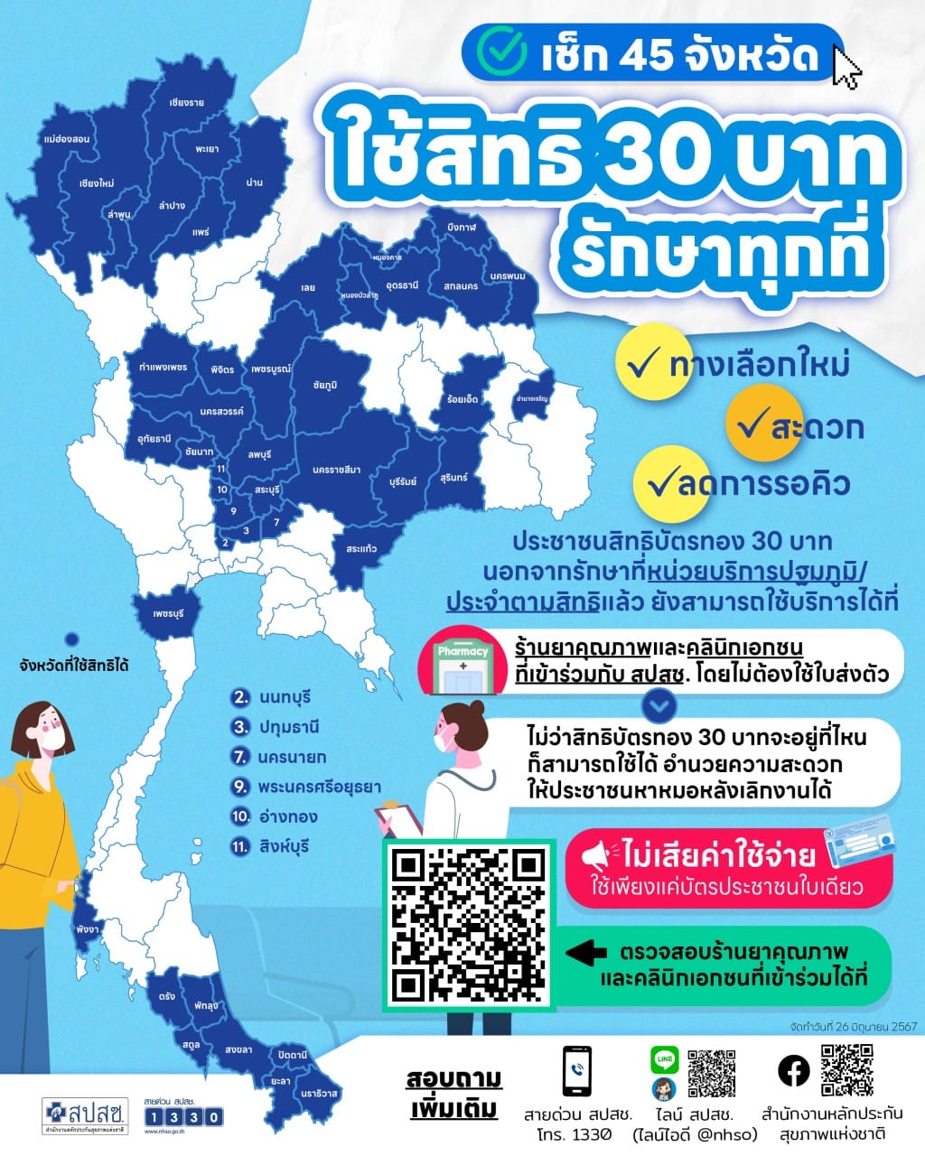 ทั้งนี้ ปัจจุบันนโยบาย 30 บาทรักษาทุกที่ ให้บริการครอบคลุมพื้นที่ 45 จังหวัดนำร่อง ดังนี้