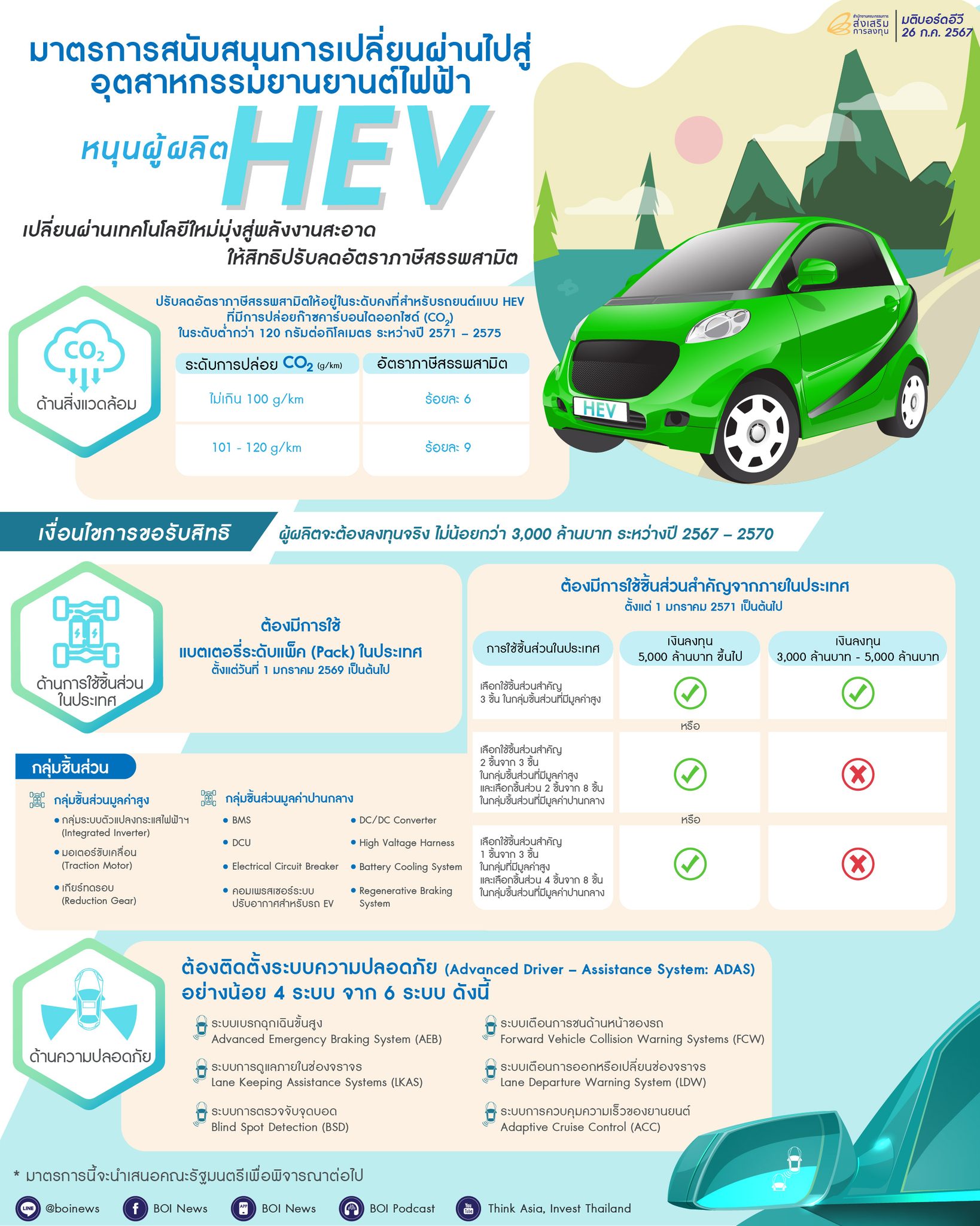- ต้องมีการใช้ชิ้นส่วนสำคัญที่ผลิตหรือประกอบในประเทศ โดยรถยนต์ HEV รุ่นที่ขอรับสิทธิ ต้องใช้แบตเตอรี่ที่ผลิตในประเทศตั้งแต่ปี 2569 และต้องใช้ชิ้นส่วนสำคัญอื่นๆ ตั้งแต่ปี 2571 เป็นต้นไป โดยแบ่งเป็น 2 กลุ่ม คือ ชิ้นส่วนสำคัญที่มีมูลค่าสูง 3 ชิ้น ได้แก่ Traction Motor, Reduction Gear, Inverter และชิ้นส่วนสำคัญที่มีมูลค่าปานกลาง 8 ชิ้น ได้แก่ BMS, DCU, คอมเพรสเซอร์ระบบปรับอากาศสำหรับ BEV, Electrical Circuit Breaker, DC/DC Converter, High Voltage Harness, Battery Cooling System, Regenerative Braking System โดยจะขึ้นกับมูลค่าการลงทุน