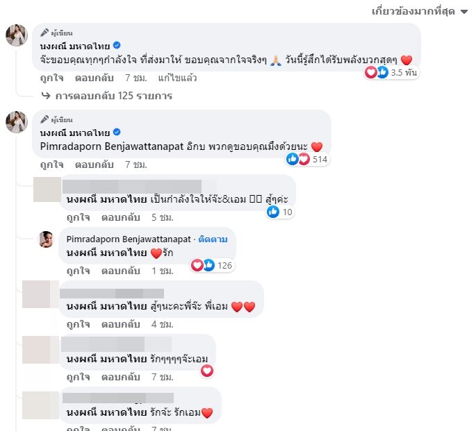 อีกทั้งยังเขียนข้อความเพิ่มเติมในคอมเมนต์ว่า “จ๊ะขอบคุณทุกๆ กำลังใจที่ส่งมาให้ ขอบคุณจากใจจริงๆ วันนี้รู้สึกได้รับพลังบวกสุดๆ”