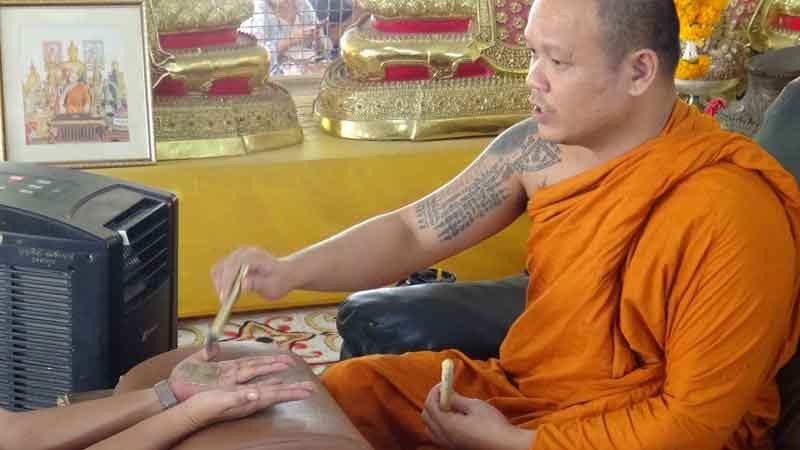 นับพันแน่นวัด แห่อาบน้ำมนต์ เจิมหน้า พระอาจารย์เอ้ หลังมีคนดวงเฮง ถูกรางวัลที่1 บางคนนำรถมาเจิม เพื่อเป็นศิริมงคล และเพื่อความสบายใจ
