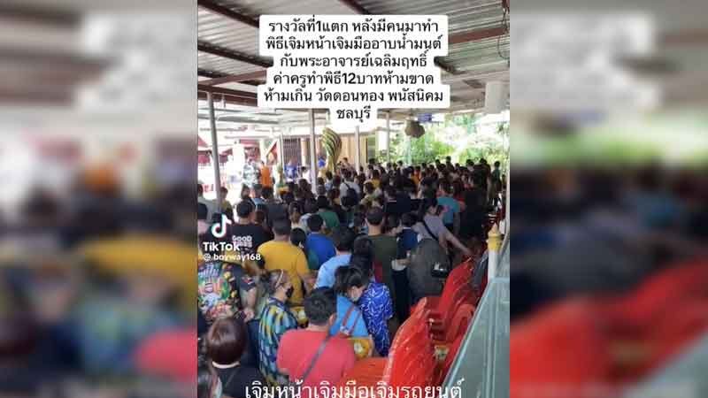 เมื่อเวลา 13.00 น. วันที่ 13 ส.ค.2566 ผู้สื่อข่าวรายงานว่า บรรยากาศที่วัดดอนทอง ต.วัดโบสถ์ อ.พนัสนิคม จ.ชลบุรี หลังจากที่ในโซเชียล มีการแชร์คลิปติ๊กต็อก หลังมีคนมาอาบน้ำมนต์เจิมหน้าและมือแล้วถูกรางวัลที่1 โดยวันนี้พบมีชาวบ้านและลูกศิษย์จำนวนกว่า 1,000 คน มารอคิวอาบน้ำมนต์และเจิมมือกับเจิมหน้ากับพระอาจารย์เฉลิมฤทธิ์ คุเณสโก หรือพระอาจารย์เอ้ ที่ทำการเจิมมืออาบน้ำมนต์มานานกว่า 10 ปี