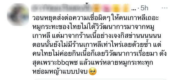 "วอนหยุดส่งต่อความเชื่อผิด ๆ ให้คนเกาหลีเถอะ หมูกระทะของไทยไม่ได้วิวัฒนาการมาจากหมูเกาหลี แต่มาจากร้านเนื้อย่างเจงกิสข่าน ตอนนั้นยังไม่มีร้านเกาหลีเท่าไหร่เลยด้วยซ้ำ แต่คนไทยไม่ค่อยกินเนื้อ ก็เลยวิวัฒนาการเรื่อยมา ดังสุดเพราะ BBQ พซ แล้วแพร่หลายหมูกระทะทุกหย่อมหญ้าแบบปัจจุบัน"