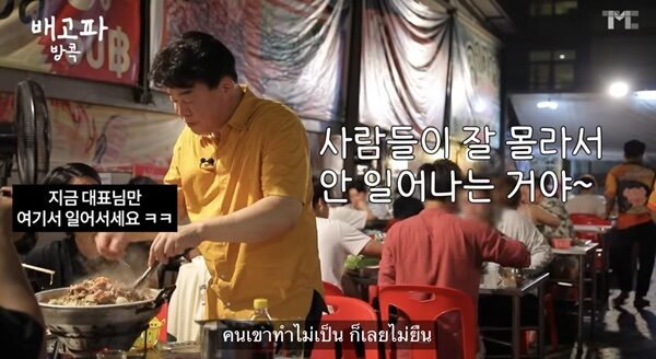"ในบรรดาแขกที่มาที่นี่ ผมน่าจะเป็นคนที่ย่างเก่งที่สุด” และยังโชว์ให้ดู โดยบรรยายใต้คลิปว่า “คนกรุงเทพทุกคนครับ ได้ยินมาว่าหมูกระทะเริ่มมาจากที่เกาหลีเหรอครับ ผมต้องใช้โอกาสนี้บอกวิธีทานหมูย่างที่ถูกต้องแบบเกาหลีหน่อยแล้วล่ะครับ วันนี้เราจะไม่นั่งอยู่กับที่ครับ! ทุกคนช่วยยืนดูเลยนะครับ”