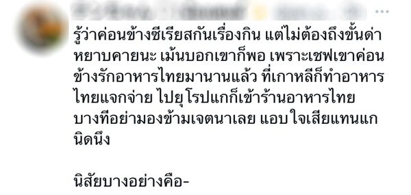 "รู้ว่าค่อนข้างซีเรียสกันเรื่องกิน แต่ไม่ต้องถึงขั้นด่าหยาบคายนะ เม้นบอกเขาก็พอ เพราะเชฟเขาค่อนข้างรักอาหารไทยมานานแล้ว ที่เกาหลีก็ทำอาหารไทยแจกจ่าย ไปยุโรปแกก็เข้าร้านอาหารไทย บางทีอย่ามองข้ามเจตนาเลย แอบใจเสียแทนแกนิดนึง