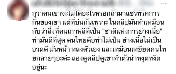 แต่ที่บ่นกันเพราะในคลิปมันทำเหมือน กับว่าสิ่งที่คนเกาหลีที่เป็น ‘ชาติแห่งการย่างเนื้อ’ ทำมันดีที่สุด คนไทยคือทำไม่เป็น ย่างเนื้อไม่เป็นอวดดี มั่นหน้า หลงตัวเอง และเหมือนเหยียดคนไทยกลาย ๆ อะค่ะ ลองดูคลิปดูเขาทำตัวน่าหงุดหงิดอยู่นะ"