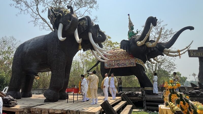วันที่ 12 เม.ย.2569 ที่ลานหน้ามหาเทพตะเคียนทอง สถานที่แสดงงานศิลปะประดิษฐานของพระอินทร์ทรงช้างเอราวัณ และพระพิฆเนศทรงช้างเอราวัณ ที่แกะสลักจากไม้ตะเคียนทองทั้งองค์ พระอินทร์ทรงช้างเอราวัณ มีความสูง 14.50 เมตร ใช้ไม้ตะเคียนทอง 19 ลำ รถ 10 ล้อ น้ำหนักทั้ง 2 องค์ องค์ละ 100 ตัน ถือว่าเป็นประติมากรรมที่ใหญ่ที่สุดในโลก แกะสลักด้วยช่างสล่าล้านนา อ.สันกำแพง จ.เชียงใหม่ ใช้เวลา 4 ปี