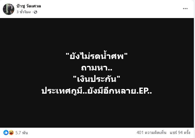 ป๋าชู ยังโพสต์ข้อความซัดแรงอีกหลายโพสต์ด้วย อาทิ ““ยังไม่รดน้ำศพ” ถามหา.. "เงินประกัน" ประเทศกูมี..ยังมีอีกหลาย.EP..” ท่ามกลางคอมเมนต์วิพากษ์วิจารณ์ร้อนแรง ต่างๆ นานา