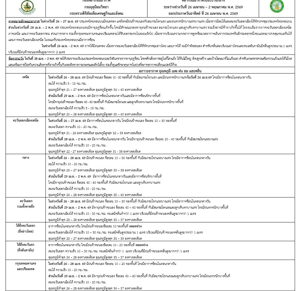 ในช่วงวันที่ 26-28 เม.ย. 69 มีฝนฟ้าคะนอง ร้อยละ 10–30 ของพื้นที่ กับมีลมกระโชกแรงบางแห่ง โดยมีอากาศร้อนในตอนกลางวัน ลมใต้ ความเร็ว 10-20 กม./ชม. อุณหภูมิต่ำสุด 23–27 องศาเซลเซียส อุณหภูมิสูงสุด 33–38 องศาเซลเซียส