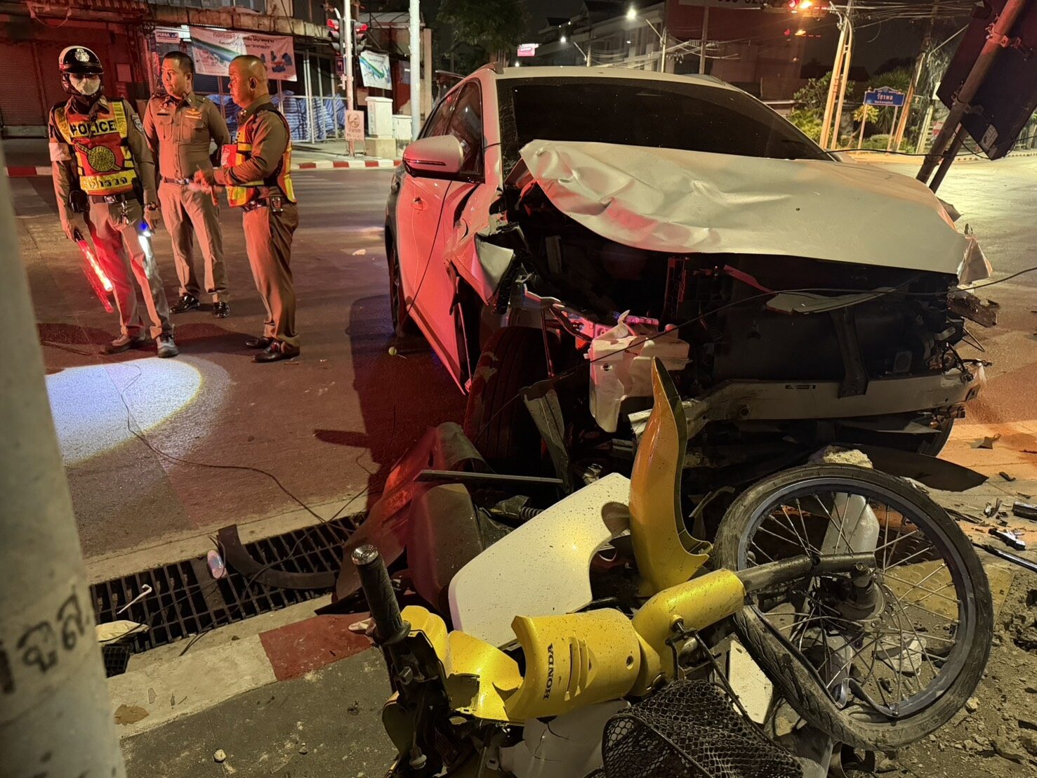 สอบถามพยานบริเวณที่เกิดเหตุ ให้การว่า เห็นชายคนขี่และหญิงนั่งซ้อนท้ายรถจักรยานยนต์ จอดนิ่งขณะสัญญาณไฟแดง อยู่บริเวณฝั่งถนนสุขาภิบาล ระหว่างนั้นมีรถยนต์คู่กรณี สีขาว ขับขี่มาไม่เบรกพุ่งเสยชนท้ายรถจักรยานยนต์เต็มแรง ลากครูดไถลถนนกลางห้าแยกเป็นทางยาว ก่อนขึ้นฟุตปาธพุ่งชนเสาไฟสัญญาณจราจร หักโค่น 1 เสา