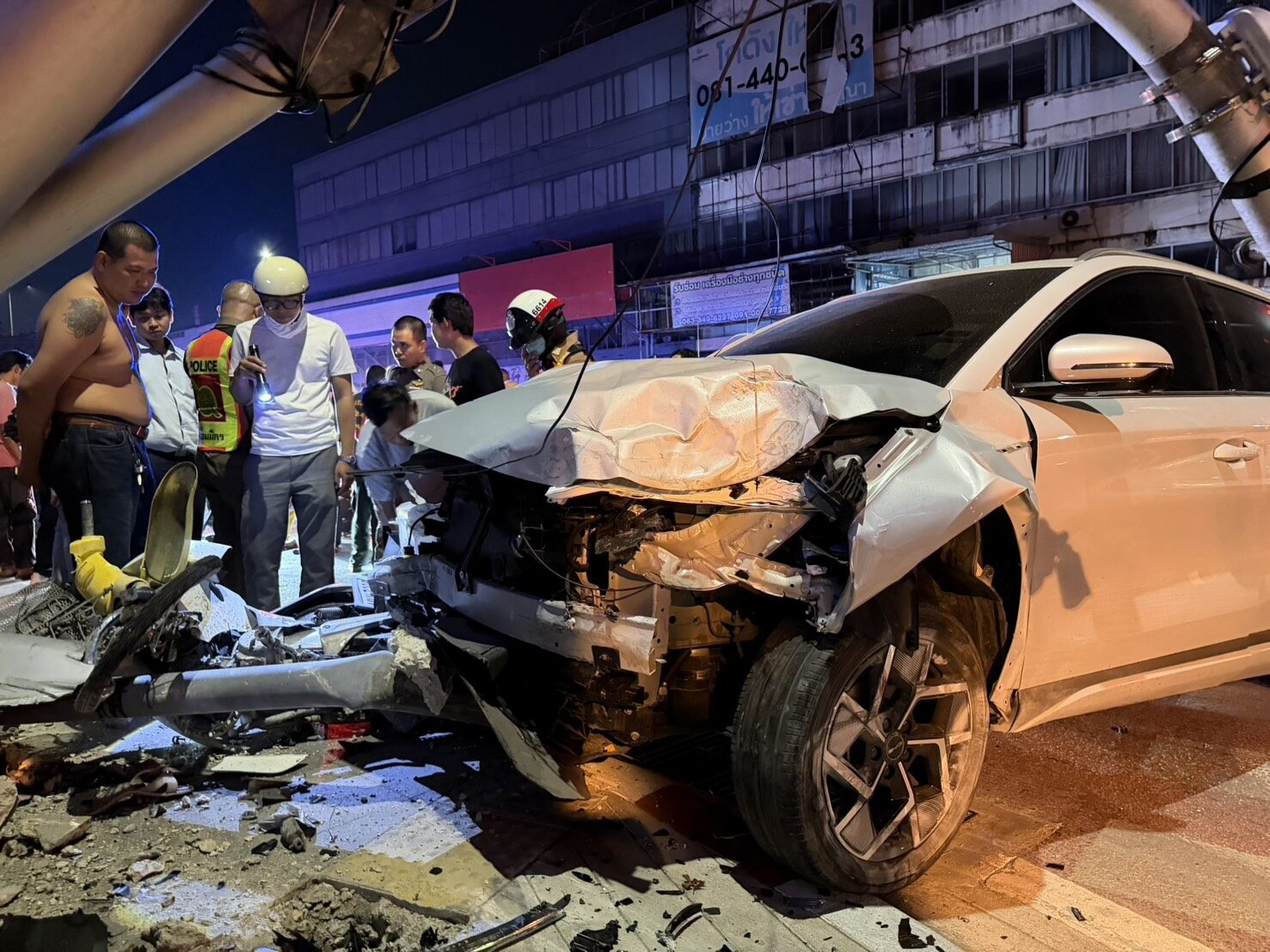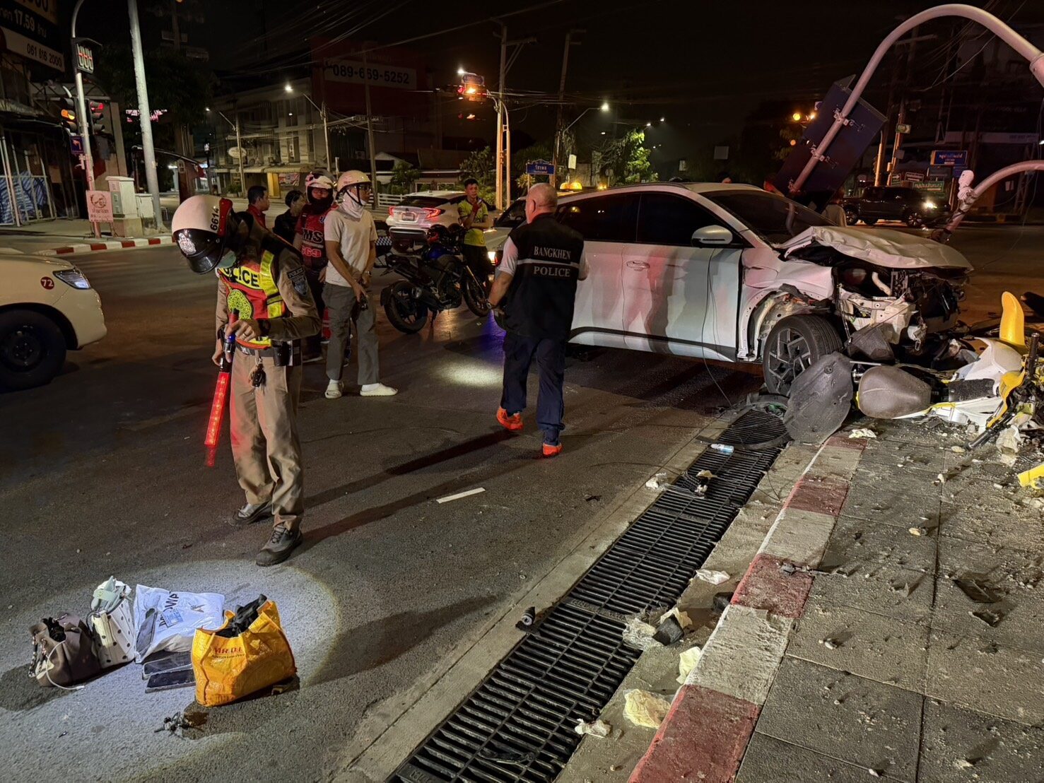 ที่เกิดเหตุพบ รถยนต์ไฟฟ้า สีขาว ทะเบียนกทม. หน้ารถพังยับ พุ่งเสยรถจักรยานยนต์ ทะเบียน ฉะเชิงเทรา ใกล้กันพบร่าง น.ส.กุศลิน (สงวนนามสกุล) อายุ 30 ปี บาดเจ็บสาหัส หน่วยกู้ชีพเอราวัณ จึงช่วยเหลือปั๊มหัวใจประมาณ 30 นาทีแต่ไม่เป็นผลเสียชีวิตในเวลาต่อมา เบื้องต้นจากการตรวจสอบพบยาเสพติดซุกซ่อนจำนวนหนึ่ง จึงยึดไว้เพื่อขยายผล