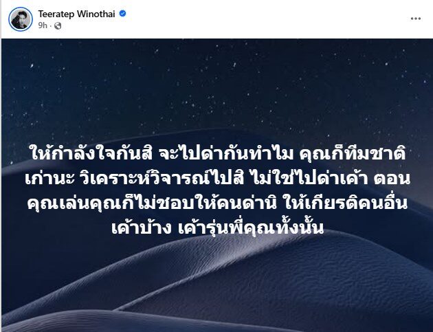 ต่อมา ''ลีซอ'' ธีรเทพ วิโนทัย อดีตศูนย์หน้าทีมชาติไทย โพสต์ข้อความผ่านทางเฟซบุ๊ก ระบุว่า ให้กำลังใจกันสิ จะไปด่ากันทำไม คุณก็ทีมชาติเก่านะ วิเคราะห์วิจารณ์ไปสิ ไม่ใช่ไปด่าเค้า ตอนคุณเล่นคุณก็ไม่ชอบให้คนด่านิ ให้เกียรติคนอื่นเค้าบ้าง เค้ารุ่นพี่คุณทั้งนั้น