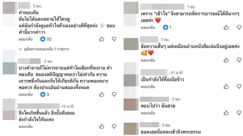 ฉันเคยเศร้า ฉันผ่านมันมา และฉันยังรู้สึกอยู่ แต่ฉันก็ยังมีสิทธิ์มีความสุข มีสิทธิ์เติบโต มีสิทธิ์ใช้ชีวิตต่อ ถ้าใครสงสัยว่าฉันไม่เศร้าแล้วเหรอ คำตอบคือ ฉันไม่ได้แตกสลายให้ใครดู แต่ฉันกำลังดูแลหัวใจตัวเองอย่างดีที่สุดค่ะ”
