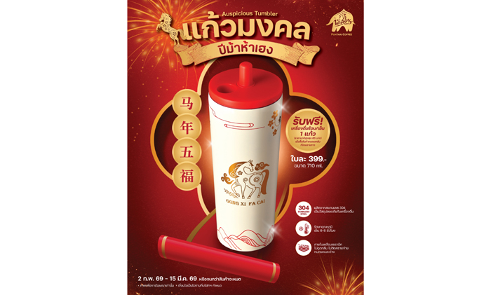 แน่นอนว่า แก้วพรีเมียมคอลเลคชันพิเศษต้องมา พลาดไม่กับ “แก้วมงคล ปีม้าห้าเฮง” แก้วทัมเบลอร์ดีไซน์สวยลายม้าสีทองติดแกลม ขนาด 710 มล. ผลิตจากวัสดุ Food Grade สแตนเลส 304 ภายในเคลือบเซรามิก เก็บอุณหภูมิได้ 6 - 8 ชั่วโมง ในราคาเพียง 399 บาท รับฟรี! เครื่องดื่มร้อนหรือเย็น 1 แก้ว ราคาปกติสูงสุด 65 บาท ตั้งแต่วันที่ 2 ก.พ. 69 – 15 มี.ค. 69 หรือจนกว่าสินค้าจะหมด ที่ร้านกาแฟพันธุ์ไทยทุกสาขาทั่วประเทศ ยกเว้นสาขาสนามบิน