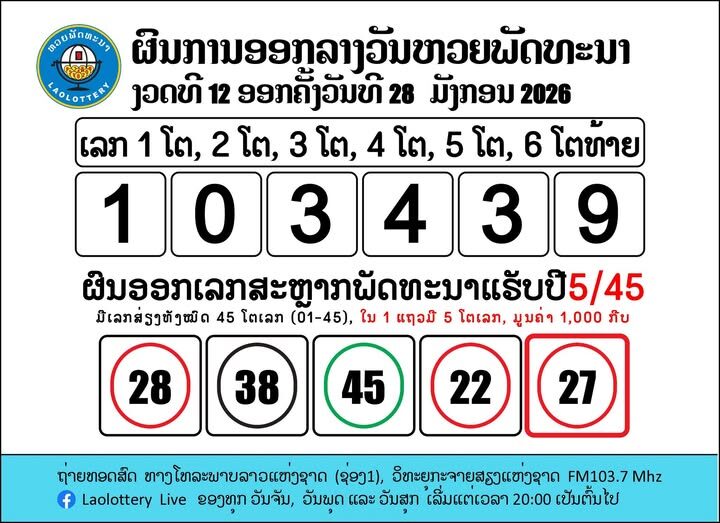 หวยลาววันนี้ งวดประจำวันที่ 28 มกราคม 2569 ผลหวยพัฒนาล่าสุด ตรวจรางวัล หวยลาว ออกอะไร