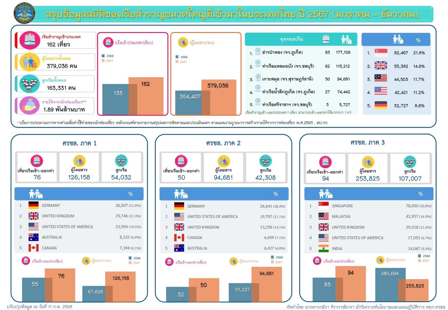 สะท้อนจาก สถิติเรือสำราญขนาดใหญ่เข้าประเทศไทย ปี 2567 อ้างอิงศูนย์อำนวยการรักษาผลประโยชน์ของชาติทางทะเล (ศรชล.) พบว่า มีเรือสำราญเข้าไทย 162 เที่ยว เพิ่มขึ้น 21.8% คิดเป็นจำนวนผู้โดยสาร 379,036 คน เพิ่มขึ้น 6.95% เมื่อเทียบกับปีก่อน (YoY) สร้างรายได้เข้าไทย 1.89 พันล้านบาท