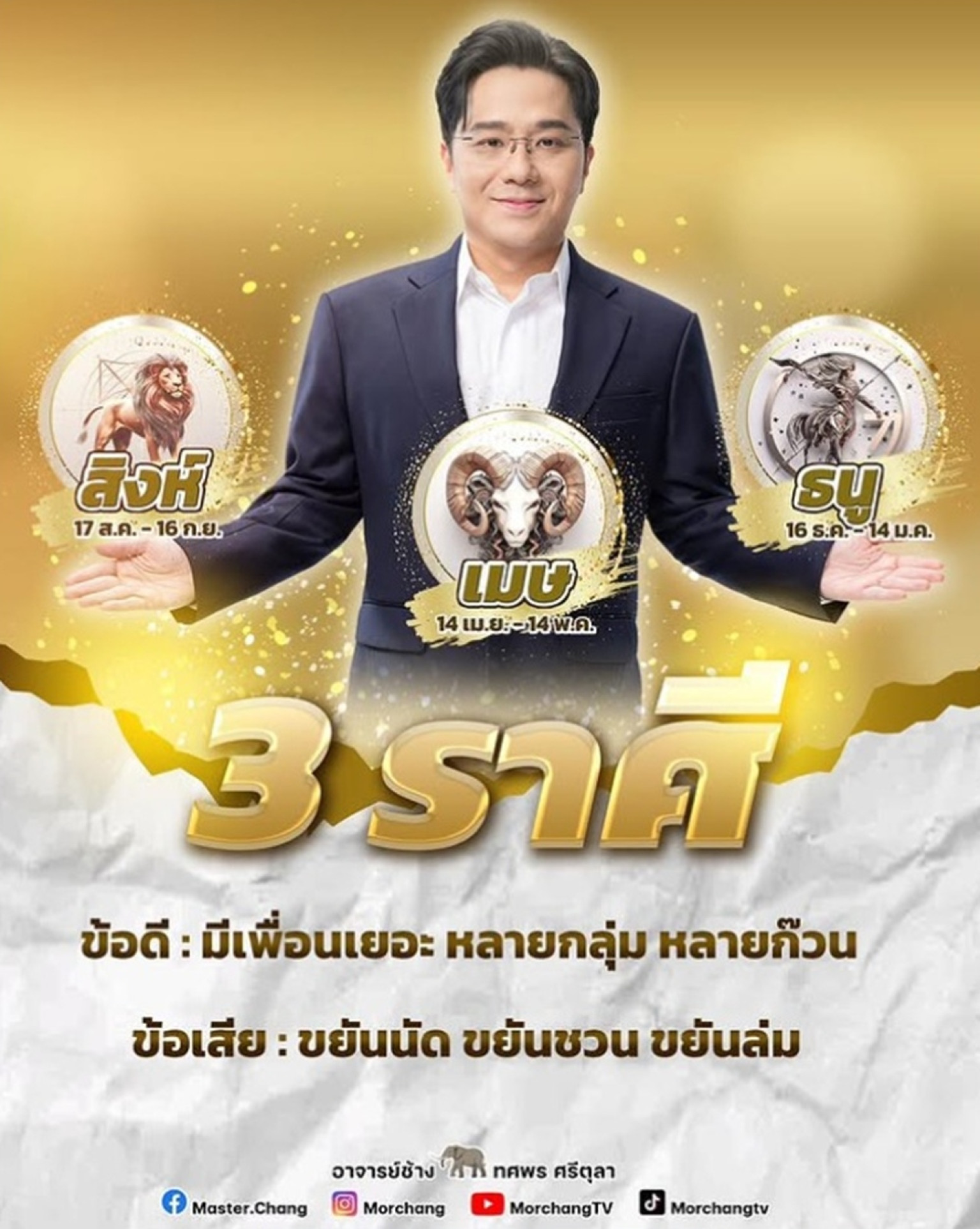 "หมอช้าง" นักพยากรณ์ชื่อดัง โพสต์ข้อความผ่านอินสตาแกรม @morchang ระบุว่า 3 ราศี ข้อดี-มีเพื่อนเยอะ หลายกลุ่ม หลายก๊วน ข้อเสีย...