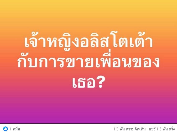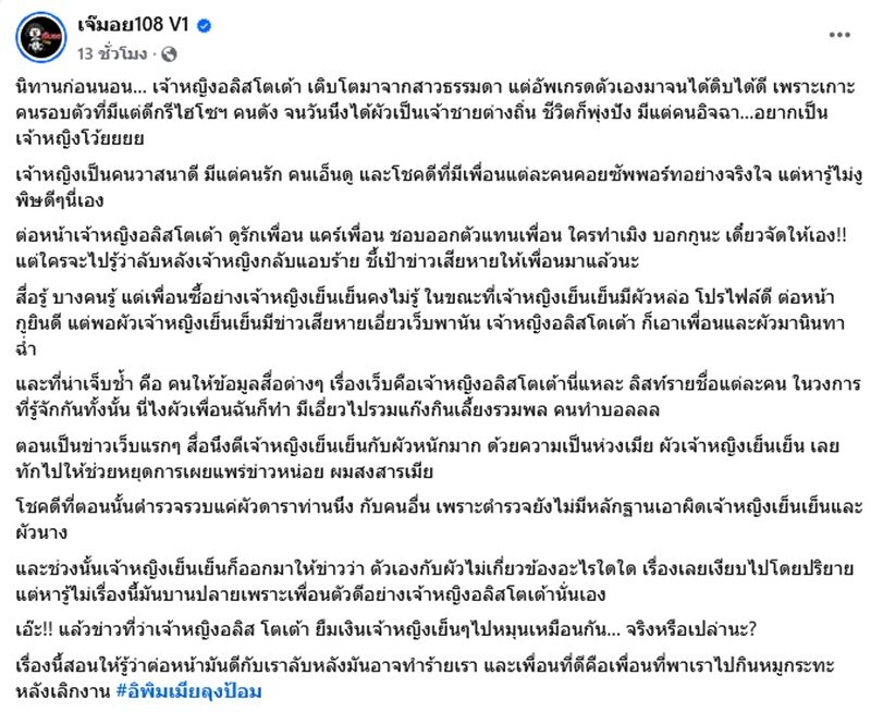 “สื่อรู้ บางคนรู้ แต่เพื่อนซี้อย่างเจ้าหญิงเย็นเย็นคงไม่รู้ ในขณะที่เจ้าหญิงเย็นเย็นมีผัวหล่อ โปรไฟล์ดี ต่อหน้ากูยินดี แต่พอผัวเจ้าหญิงเย็นเย็นมีข่าวเสียหายเอี่ยวเว็บพนัน เจ้าหญิงอลิสโตเต้า ก็เอาเพื่อนและผัวมานินทาฉ่ำ ”