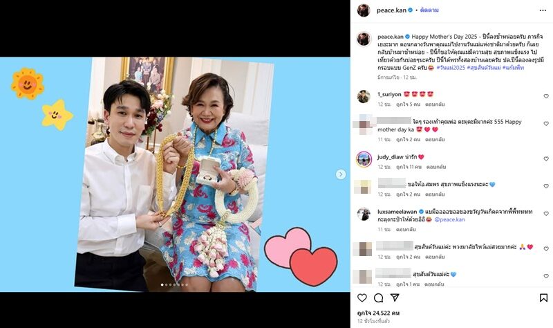 ล่าสุด พีท ยังโพสต์ภาพมอบของขวัญวันแม่ให้คุณแม่ พร้อมแคปชั่นว่า“Happy Mother's Day 2025 - ปีนี้ลงช้าหน่อยครับ ภารกิจเยอะมาก ตอนกลางวันพาคุณแม่ไปงานวันแม่แห่งชาติมาด้วยครับ ก็เลยกลับบ้านมาช้าหน่อย - ปีนี้ก็ขอให้คุณแม่มีความสุข สุขภาพแข็งแรง ไปเที่ยวด้วยกันบ่อยๆนะครับ ปีนี้ได้พรทั้งสองบ้านเลยครับ ปล.ปีนี้ลองลงรูปมีกรอบแบบ GenZ ครับ #วันแม่2025 #สุขสันต์วันแม่ #แก้มพีท”
