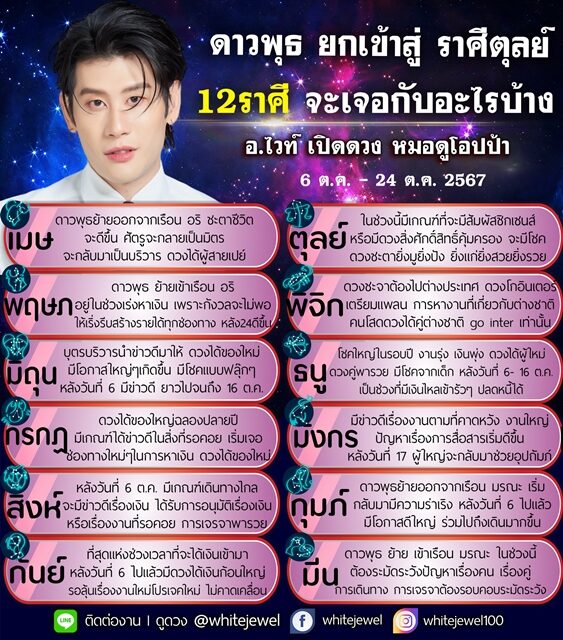 อ.ไวท์ หมอดูโอปป้า ดาวพุธ ยกเข้าสู่ ราศีตุลย์ 12 ราศี จะเจอกับอะไรบ้าง เผย ราศีใดชะตาชีวิตดีขึ้น ราศีใดหลังวันที่ 6 มีข่าวดียาวไปจนถึง 16 ต.ค. โดยมีรายละเอียดดังนี้