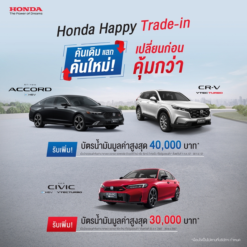 และ ข้อเสนอพิเศษรถเก่าแลกซื้อรถใหม่ (Honda Happy Trade-in) เมื่อนำรถยนต์ฮอนด้ามาขายและออกรถ แอคคอร์ด อี:เอชอีวี ใหม่ ที่โชว์รูมฮอนด้า รับเพิ่ม บัตรน้ำมันมูลค่า 40,000 บาท หรือเมื่อนำรถยนต์คันเดิมยี่ห้อใดก็ได้มาขายและออกรถ แอคคอร์ด อี:เอชอีวี ใหม่ ที่โชว์รูมฮอนด้า รับเพิ่ม บัตรน้ำมันมูลค่า 20,000 บาท ตั้งแต่ 1 กรกฎาคม 2567 – 30 กันยายน 2567