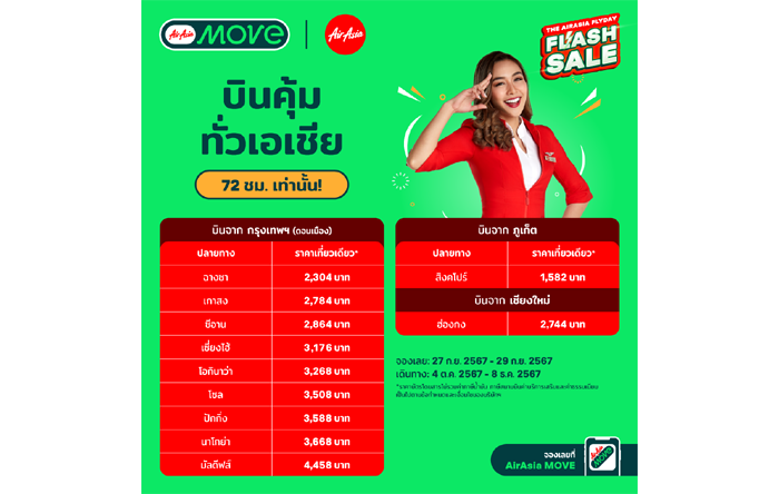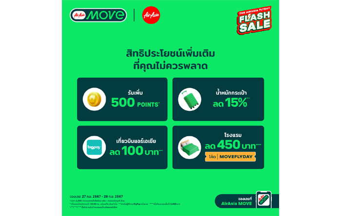 AirAsia MOVE ส่งโปรเด็ด 72 ชม. Flyday Flash Sale! มอบดีลเอ็กซ์คลูซีฟ 3 วัน ตั้งแต่ 27 - 29 กันยายน 2567 ให้คุณเดินทางท่องเที่ยวสู่ทริปในฝันในราคาสุดคุ้มเพียงปลายนิ้วสัมผัส พร้อมลุ้นรับเที่ยวบินฟรี และประหยัดยิ่งกว่ากับส่วนลดการจองเที่ยวบิน ที่พัก บริการเสริมบนเที่ยวบิน และสิทธิพิเศษอื่นๆ อีกมากมาย เตรียมพร้อมสำหรับทริปปลายปีนี้ อย่าพลาดประสบการณ์การท่องเที่ยวสุดประทับใจในราคาที่ดีที่สุด!