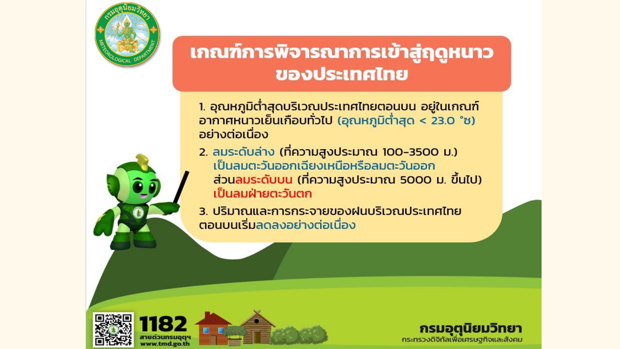 ดร.สุกันยาณี ยะวิญชาญ ผู้ตรวจราชการกระทรวงดิจิทัลเพื่อเศรษฐกิจและสังคม รักษาราชการแทนอธิบดีกรมอุตุนิยมวิทยา เปิดเผยว่า ตามเกณฑ์การพิจารณาการเข้าสู่ฤดูหนาวของประเทศไทย ซึ่งประกอบด้วย