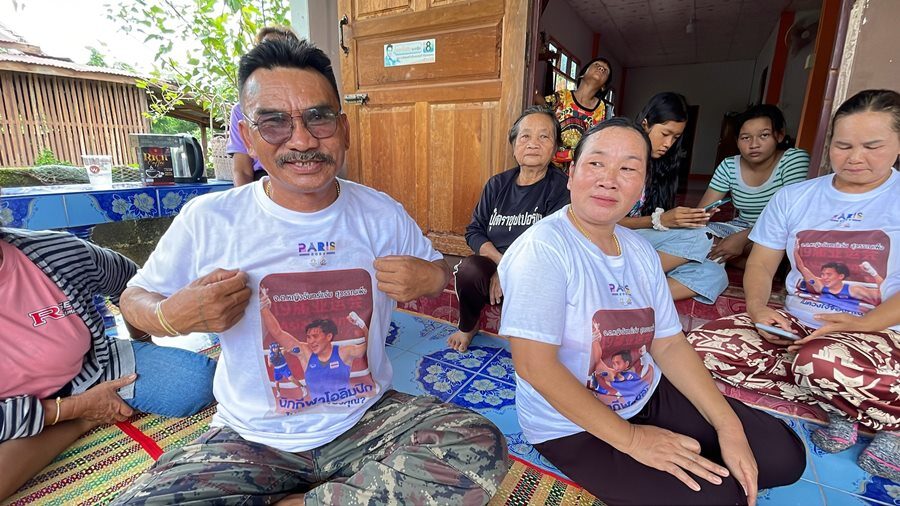 วันที่ 4 ส.ค.67 บรรยากาศที่หมู่บ้านพรประเสริฐ ต.วังหลวง อ.เฝ้าไร่ จ.หนองคาย ซึ่งเป็นบ้านของนายสุนรรณ์ สุวรรณเพ็ง นางรุ่งฤดี สุวรรณเพ็ง พ่อและแม่ของ น้องบี จันทร์แจ่ม สุวรรณเพ็ง นักชกมวยสากลสมัครเล่นหญิง วัย 24 ปี ที่กำลังลุยทำศึกโอลิมปิกอยู่ที่ประเทศฝรั่งเศส บรรยากาศเต็มไปด้วยความคึกคัก มีบรรดาญาติพี่น้องในหมู่บ้านมาเยี่ยมและส่งกำลังใจให้พ่อแม่และน้องบี ที่เตรียมจะขึ้นชกกับนักมวยชาวแอลจีเรีย ในวันที่ 7 ส.ค.นี้ โดยพ่อแม่สวมเสื้อยืดสีขาว สกรีนรูปหน้าน้องบีเป็นกำลังใจให้กับน้องบีด้วย