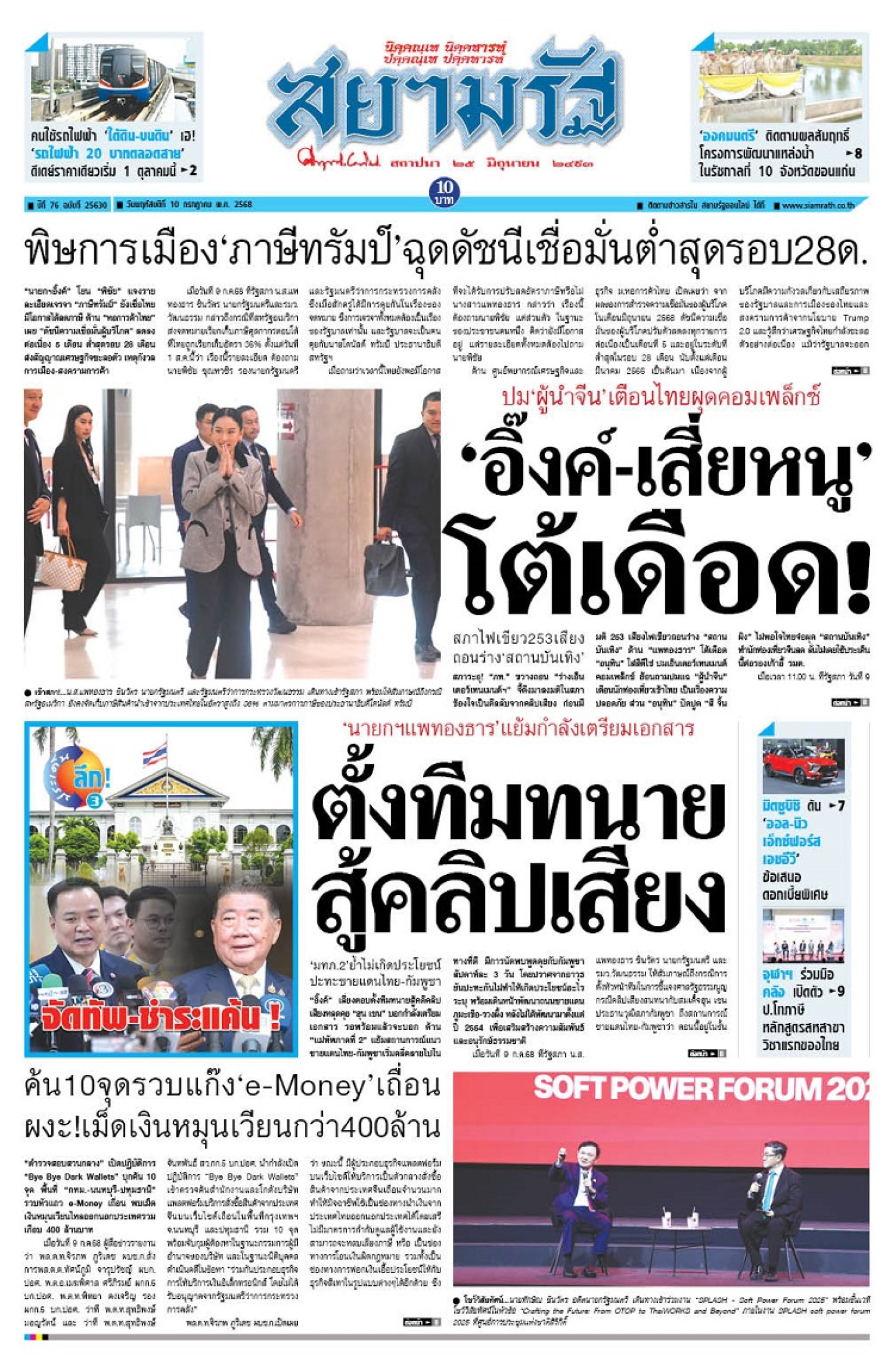 หน้า 1 หนังสือพิมพ์สยามรัฐรายวัน ฉบับวันพฤหัสบดีที่ 10 กรกฎาคม 2568