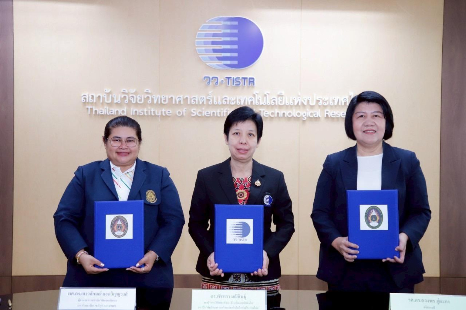 ดร.พัชทรา มณีสินธุ์ รองผู้ว่าการวิจัยและพัฒนาด้านพัฒนาอย่างยั่งยืน สถาบันวิจัยวิทยาศาสตร์และเทคโนโลยีแห่งประเทศไทย (วว.) กระทรวง อว.รศ.ดร.ดวงพร ภู่ผะกา อธิการบดี มหาวิทยาลัยราชภัฏราชนครินทร์ และ ผศ.ดร.เสาวลักษณ์ ยอดวิญญูวงศ์ ผู้อำนวยการ สถาบันวิจัยและพัฒนา มหาวิทยาลัยราชภัฏกำแพงเพชร ร่วมลงนามบันทึกข้อตกลงความร่วมมือทางวิชาการ ว่าด้วยการวิจัยวิทยาศาสตร์ เทคโนโลยี และนวัตกรรม (วทน.)ด้านพลังงานและสิ่งแวดล้อม เพื่อเพิ่มขีดความสามารถและศักยภาพให้กับบุคลากร นิสิต/นักศึกษา และประชาชน ตลอดจนชุมชนในพื้นที่ได้อย่างยั่งยืน