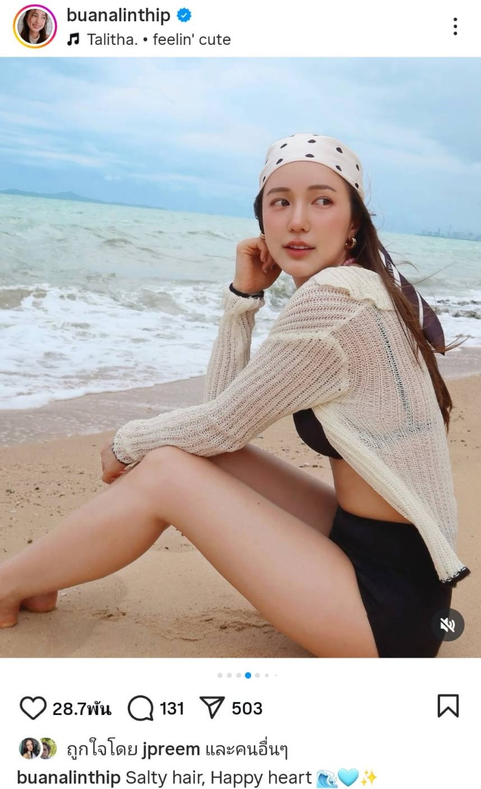 ทำเอาแฟนคลับใจละลายกันเป็นแถว เมื่อนางเอกสาวหน้าหวาน “บัว นลินทิพย์ สกิดใจ” โพสต์ภาพในลุคชิลริมทะเล แต่ไม่ทิ้งความเซ็กซี่แบบละมุน กับชุดบิกินี่สีดำที่เผยผิวขาวเนียน พร้อมแมตช์เสื้อคลุมถักและผ้าพันศีรษะลายจุด เติมกลิ่นอายวินเทจน่ารักลงตัว