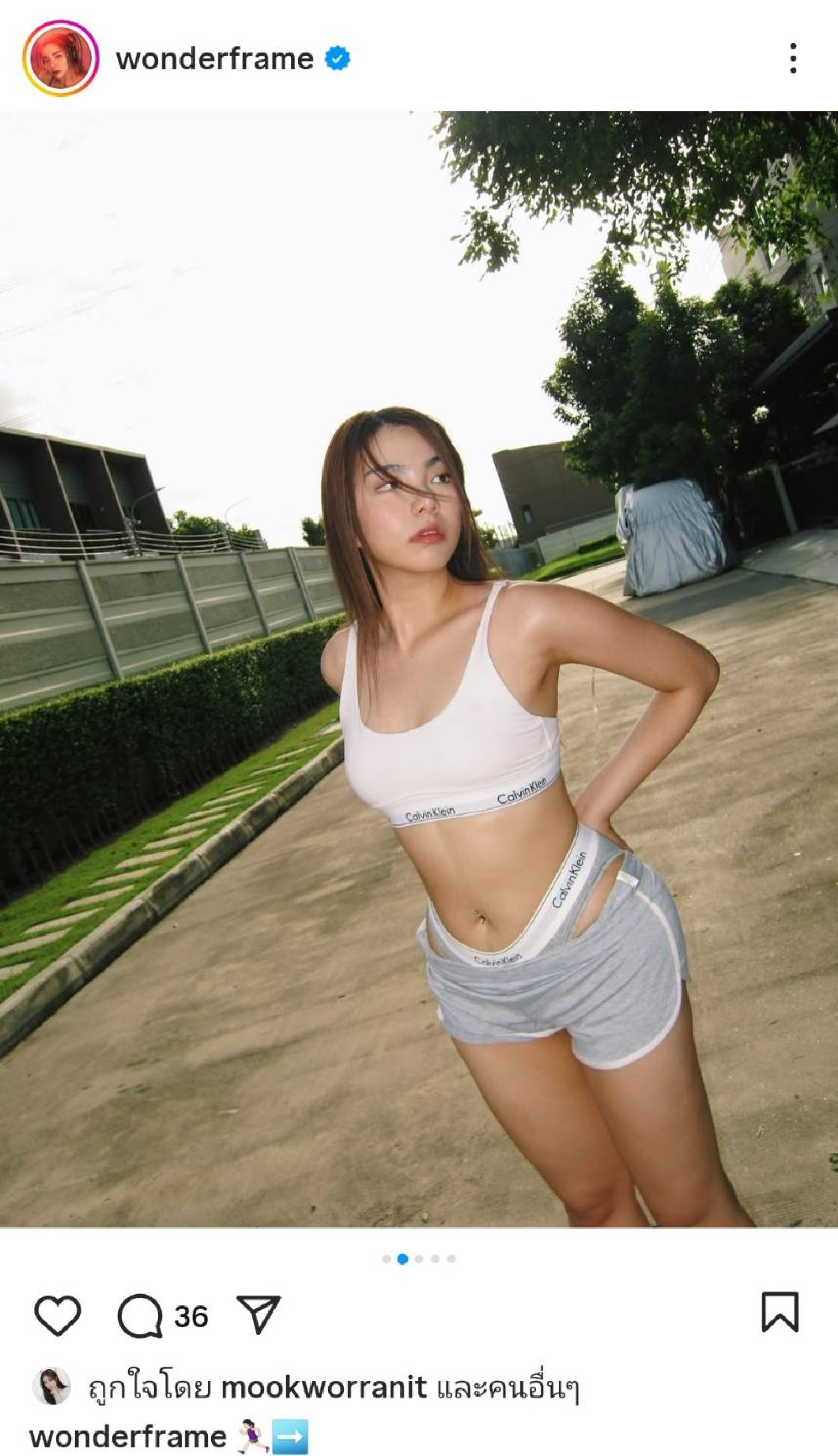 ทำเอาอินสตาแกรมร้อนระอุอีกครั้ง เมื่อศิลปินสาวเสียงดี "วันเดอร์เฟรม" หรือ แฟรม-ศุภัคชญา สุขใบเย็น โพสต์ภาพเซ็ตใหม่สุดแซ่บกลางแจ้งในชุดสปอร์ตบราและกางเกงขาสั้นแบรนด์ดัง Calvin Klein ที่เผยให้เห็นรูปร่างสุดเป๊ะ ผิวเนียนใส พร้อมท่าโพสมั่นใจทุกองศา