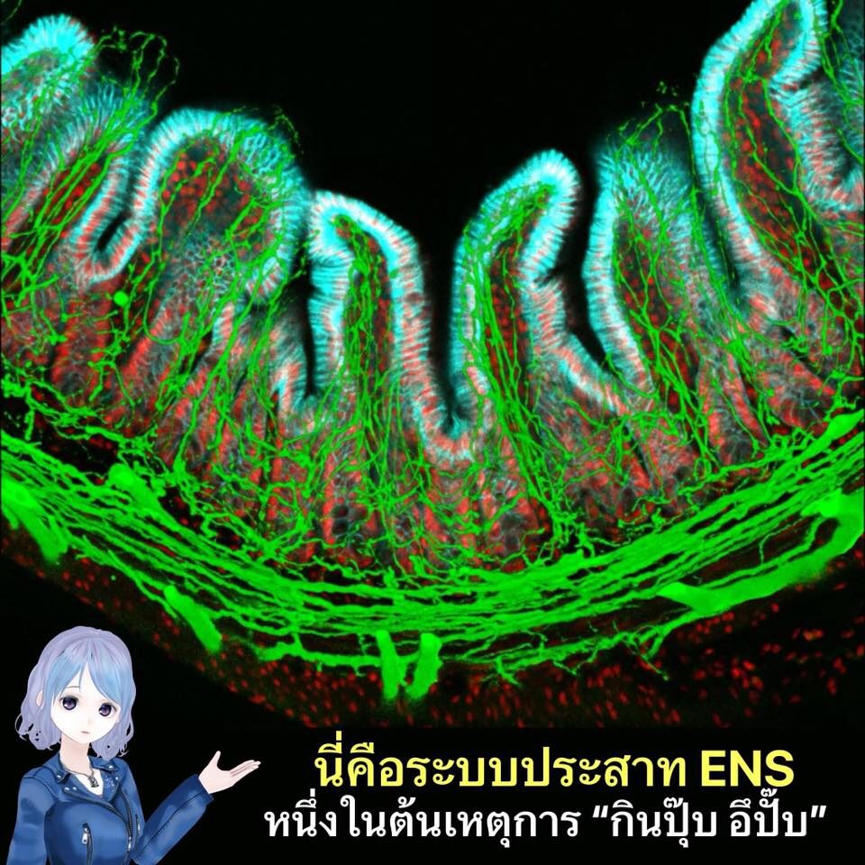 สรุป: เส้นสีเขียวๆ ในภาพคือระบบประสาทประจำทางเดินอาหาร ใครทำงานไว จะทำให้กินอาหารแล้วลำไส้ใหญ่ถูกสั่งให้บีบแรงจนปวดท้องถ่ายนั่นเอง