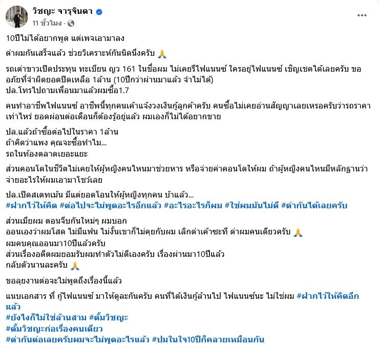 ตั้ม วิชญะ โพสต์โต้ปมรถเต่า-คอนโด ต่อไปจะไม่พูดอะไรอีก เผยตอนจีบ หญิงออน บอกเองว่าโสด ไม่งั้นเขาก็ไม่คุยกับผม ลั่นเลิกด่าภรรยา ด่าผมคนเดียว