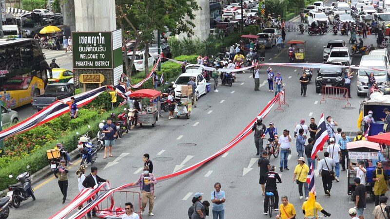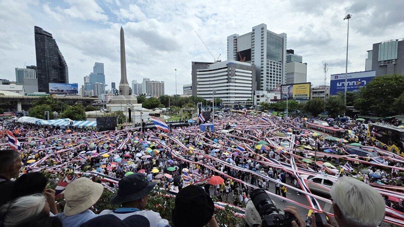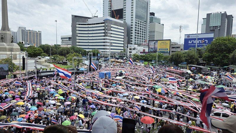 เมื่อเวลา 15.00น. วันที่ 28 มิ.ย. 2568 ที่อนุสาวรีย์ประชาธิปไตย ผู้สื่อข่าวรายงานบรรยากาศของกลุ่มมวลชนคณะรวมพลังแผ่นดินปกป้องอธิปไตยไทย บริเวณอนุสาวรีย์ชัยสมรภูมิ มีประชาชนทยอยเข้าร่วมกิจกรรมอย่างต่อเนื่อง จนต้องปิดถนนครึ่งหนึ่งบริเวณรอบอนุสาวรีย์ชัยฯ และมีอีกจำนวนมากที่อยู่บนสกายวอล์ก และห้างสรรพสินค้า บริเวณใกล้เคียงเนื่องจากอากาศที่ร้อนอบอ้าว จากการคาดการณ์คาดว่ามี ประชาชนเข้าร่วมกิจกรรมกว่า 5,000 คน และคาดว่าจะมีการเดินทางเข้ามาร่วมกิจกรรมอย่างต่อเนื่อง