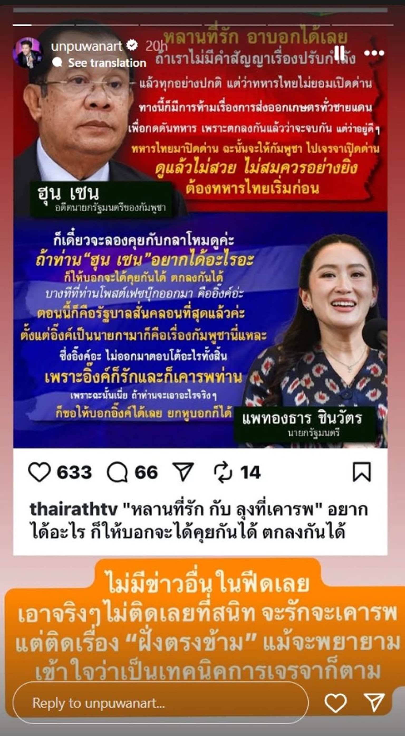 เรียกไลค์รัวๆ เมื่อพิธีกรคนดัง อั๋น-ภูวนาท ออกมาแสดงความคิดเห็นประเด็นร้อน กรณีปมคลิปเสียง น.ส.แพทองธาร ชินวัตร นายกรัฐมนตรี กับ สมเด็จฮุนเซน