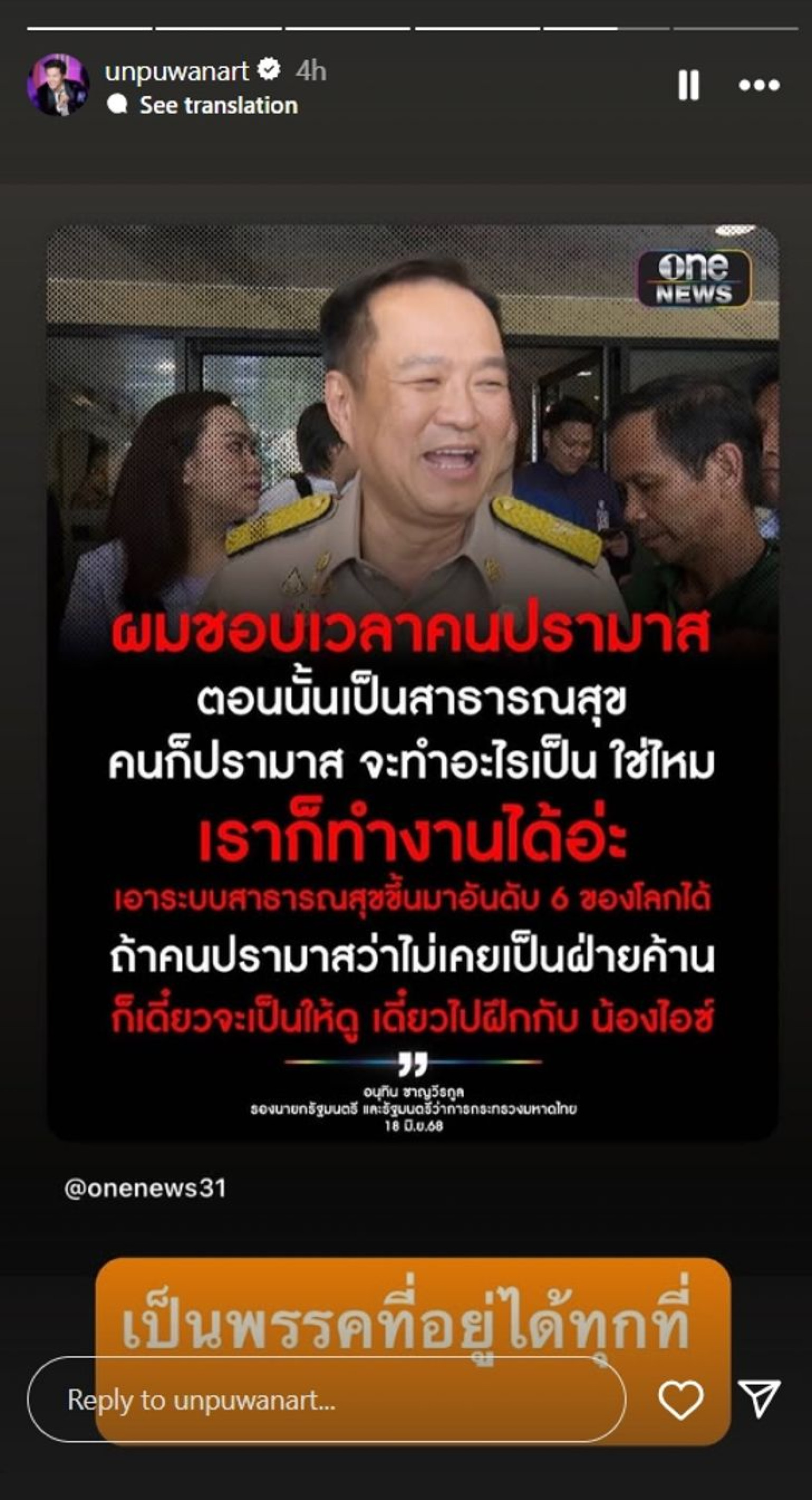 โดย อั๋น ได้โพสต์ไอจีสตอรี่ถึงกรณีดังกล่าวว่า "ไม่มีข่าวอื่นในฟีดเลย เอาจริงๆ ไม่ติดเลยที่สนิท จะรักจะเคารพ แต่ติดเรื่อง 'ฝั่งตรงข้าม' แม้จะพยายามเข้าใจว่าเป็นเทคนิคการเจรจาก็ตาม" และโพสต์ถึงพรรคภูมิใจไทยอีกว่า "เป็นพรรคที่อยู่ได้ทุกที่จริงๆ"