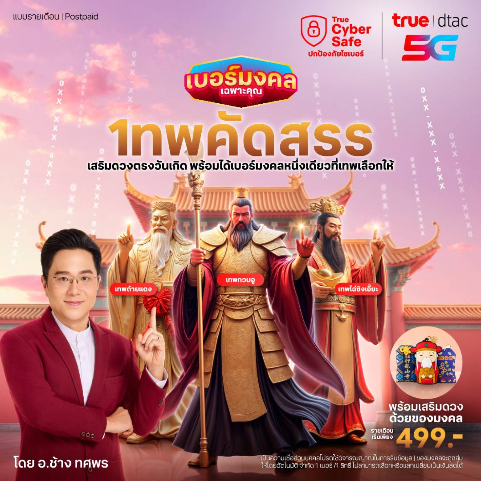 วันที่ 3 กรกฎาคม 2568 สะดวกกว่า ง่ายกว่า ตรงดวงกว่า … ทรู คอร์ปอเรชั่น ร่วมกับ อาจารย์ช้าง ทศพร ศรีตุลา เปิดตัว “เบอร์มงคลเฉพาะคุณ เทพคัดสรร” ให้คุณเลือกเทพจีน หนึ่งในสาม เทพด้ายแดง ความรัก คู่ครอง , เทพกวนอู ความสำเร็จ โด่งดัง , เทพไฉ่ซิงเอี้ยะ เงินทอง โชคลาภ แล้วให้เทพเลือกเบอร์มงคล 1 เดียวให้คุณ เสริมดวงตรงวันเกิด พร้อมเบอร์สวยผลรวมดี โดย อ.ช้าง ทศพร ศรีตุลา พร้อมรับของมงคลสุด ExMUsive! จากวัดหลงซาน ไต้หวัน สนใจเปิดใหม่ “เบอร์มงคลเฉพาะคุณ เทพคัดสรร” แบบรายเดือน แพ็กเกจเริ่มเพียง 499 บาท สะดวก ง่าย ไม่ซับซ้อน ถูกใจ Gen Z รีบเลย!! ที่ ทรูช็อป ดีแทคช็อป ตัวแทนจำหน่าย ทุกสาขาทั่วประเทศ และช่องทางออนไลน์