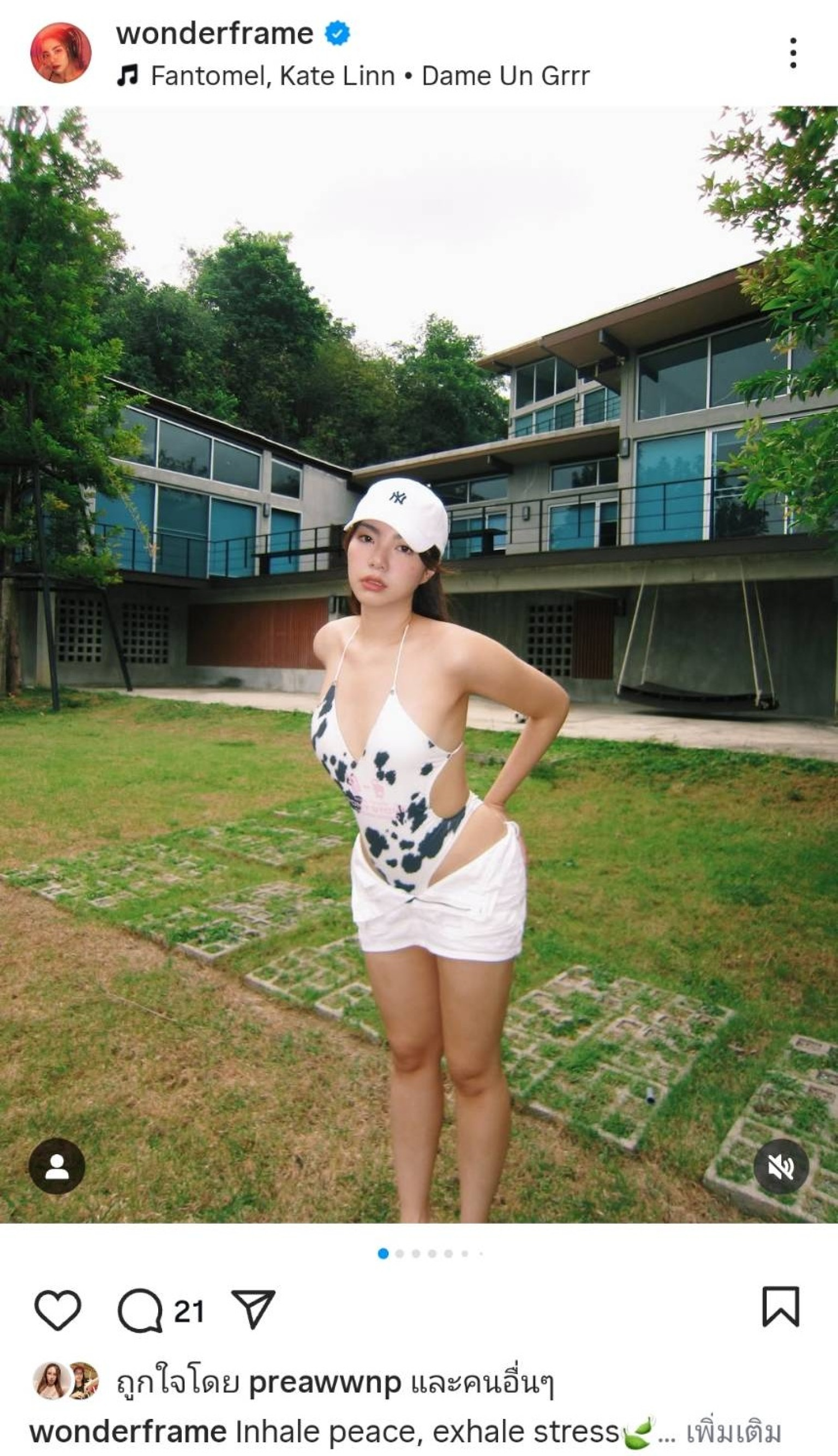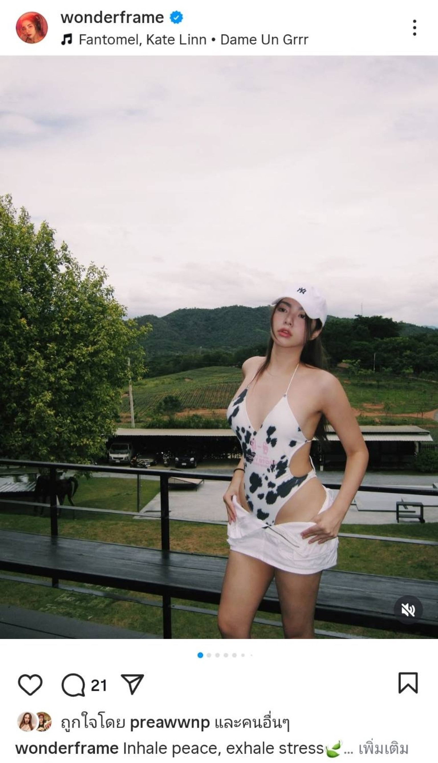 "วันเดอร์เฟรม" หรือ "Wonderframe" ศิลปินสาวเสียงดี ขวัญใจสายโซเชียล กลับมาทวงบัลลังก์ความแซ่บอีกครั้งผ่านอินสตาแกรมส่วนตัว โพสต์ภาพสุดชิคในชุดว่ายน้ำวันพีซลายวัวเว้าสูงสุดเซ็กซี่ โชว์แผ่นหลังและสัดส่วนสุดปัง พร้อมแคปชั่นเบาๆ ชวนชิลล์ว่า “Inhale peace, exhale stress🍃” ท่ามกลางวิวธรรมชาติสุดสดชื่นที่ตัดกับลุคของเธออย่างลงตัว