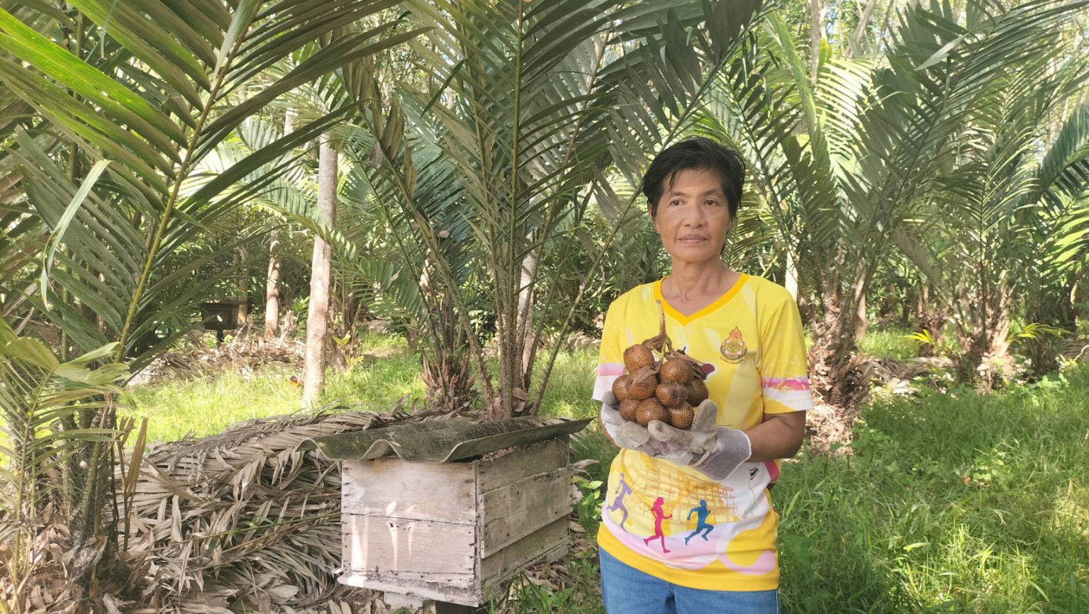 นางชวนขวัญ ปล้องพันธ์ เกษตรกรชาวสวนยางพารา หมู่ 3 ตำบลทุ่งหวัง อ.เมืองสงขลา จ.สงขลา ปลูกสละอินโดร่วมกับยางพารา เก็บผลผลิตสร้างรายได้เสริมให้ครอบครัว