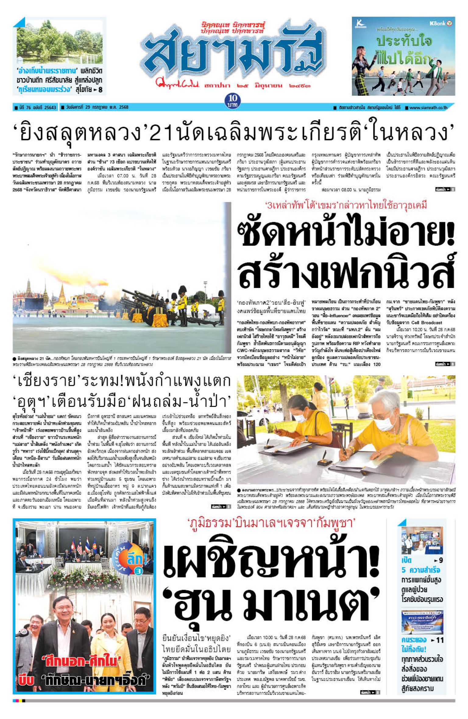 หน้า 1 หนังสือพิมพ์สยามรัฐรายวัน ฉบับวันอังคารที่ 29 กรกฎาคม 2568