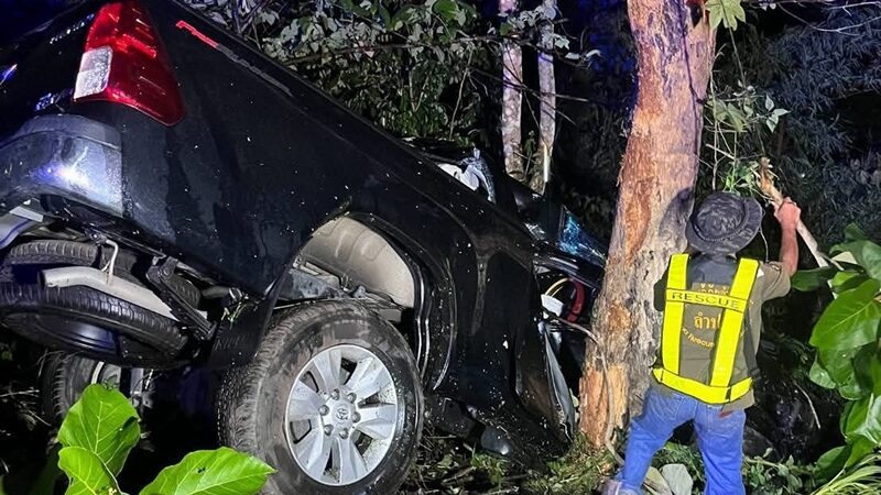 สาวขับกระบะกลับบ้าน วันหยุดยาว รถแหกโค้งชนต้นไม้ อัดร่างดับสลด