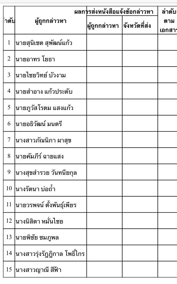 โดยในจำนวนนี้มี นางสุขสมรวย วันทนียกุล สส.อำนาจเจริญ เขต 1 พรรคภูมิใจไทย นายพิชัย ชมภูพล สส.สุราษฎร์ธานี เขต 6 พรรคภูมิใจไทย เป็นผู้ถูกกล่าวหาด้วย รวมทั้ง นางรัตนา บ่อถ้ำ บุคคลสำคัญในพรรคการเมืองหนึ่ง มีรายชื่อด้วยเช่นกัน